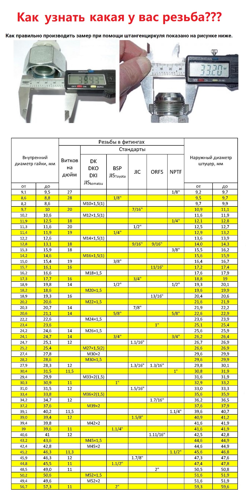 Для того что бы понять какой фитинг и с какой резьбой находится у вас в руках вам потребуется штангенциркуль, таблица с размерами и измеряемый образец. В таблице присутствуют два столбика с наружными и внутренними размерами, после измерения исследуемого образца сопоставьте измеренное значение с табличным и определите вид и размер вашей резьбы.