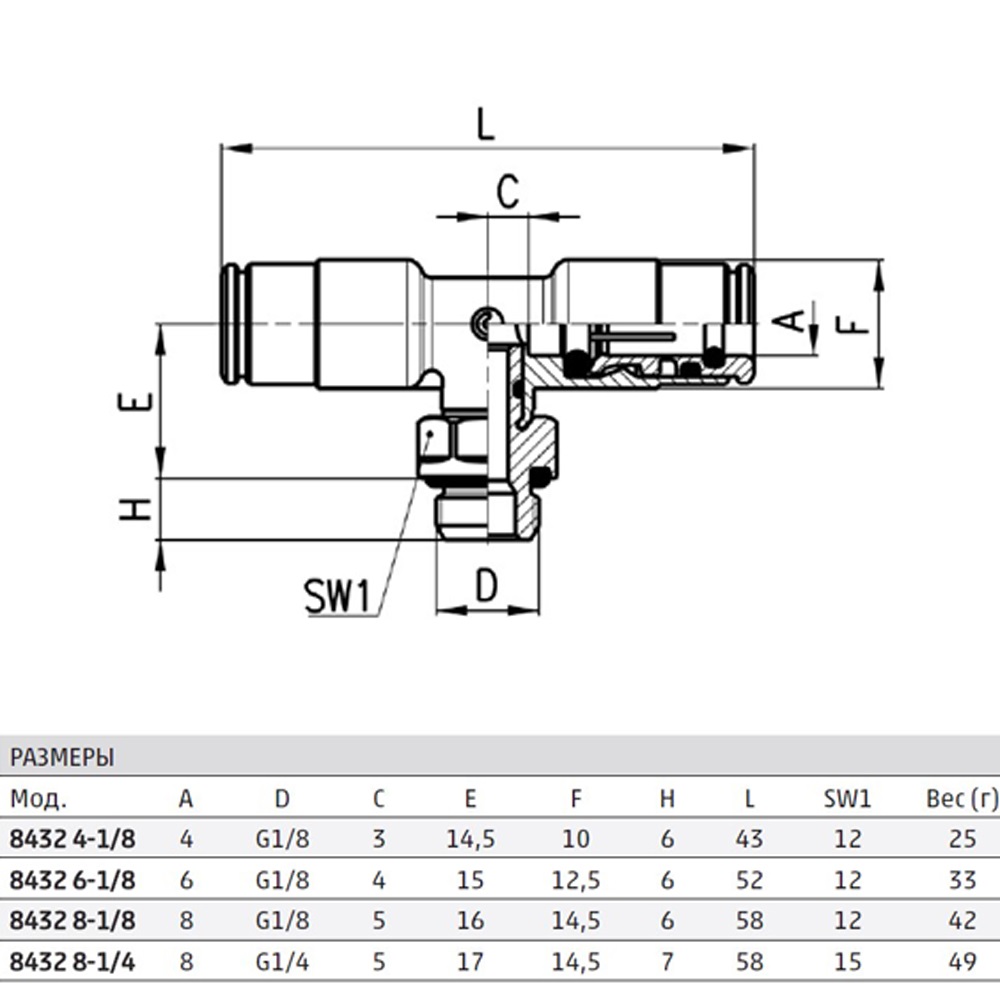 Фитинг 8432 8-1/4 угловой пневматический цанговый с двойным уплотнительным кольцом CAMOZZI