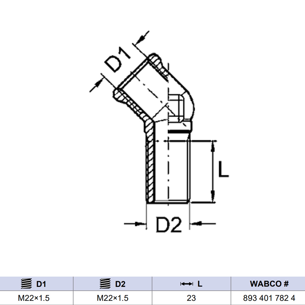 Фитинг переходник наружная М22х1,5 внутренняя М22х1,5 угловой латунный WABCO