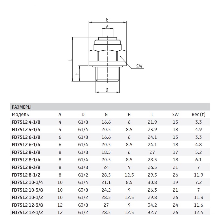 Фитинг пневматический FD7512 8-1/8 цанговый прямой цилиндрическая резьба BSP CAMOZZI