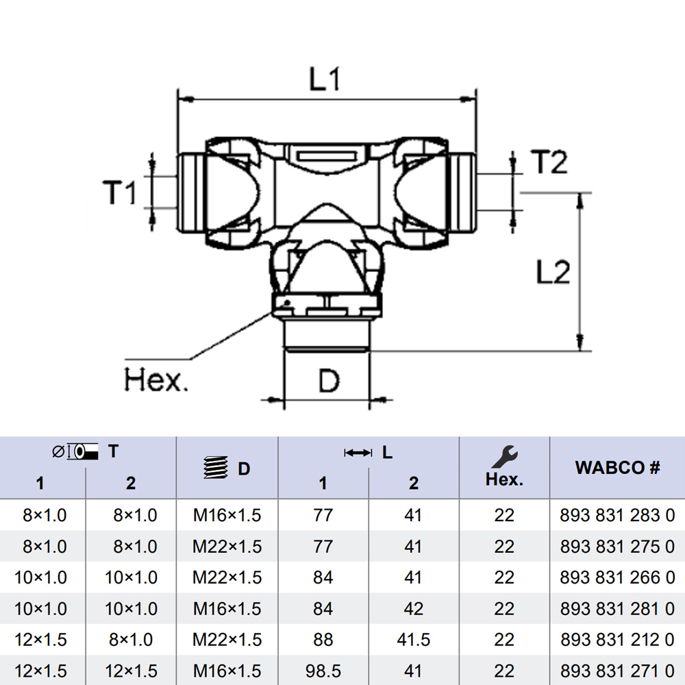 Фитинг тройник воздушный трубка 8х1мм M22x1,5 цанга-резьба композитный WABCO