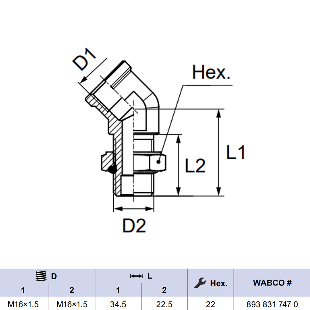 Фитинг угловой наружная М16х1,5 внутренняя М16х1,5 латунный WABCO