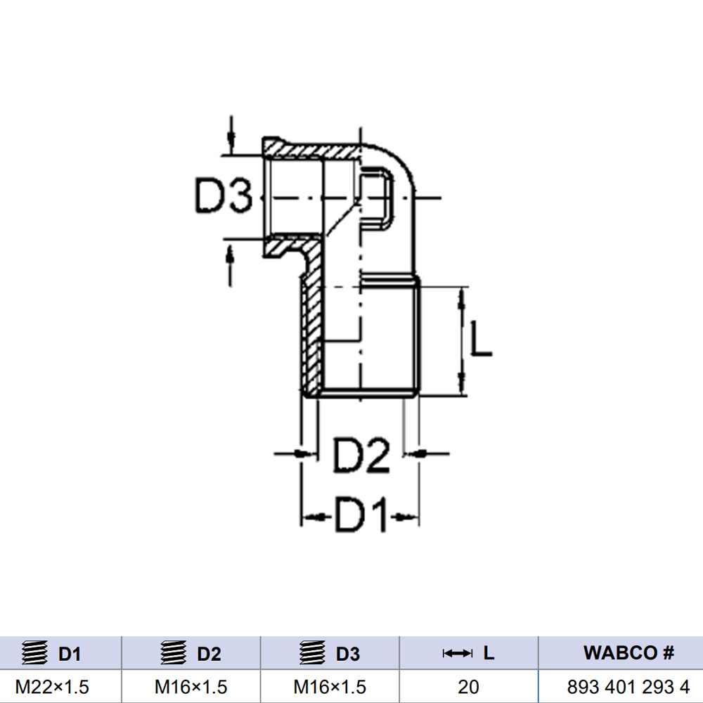 Фитинг угловой наружная М22х1,5 внутренняя М16х1,5 латунный WABCO