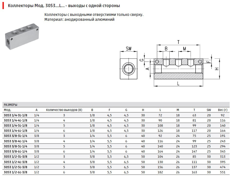 Коллектор 3053 1/4-4L-1/8 (4 выхода односторонний) CAMOZZI